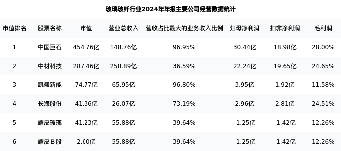 耀皮玻璃最新报告期数据为年报,下表汇总了玻璃玻纤行业内市值靠前的公司年报主要经营数据