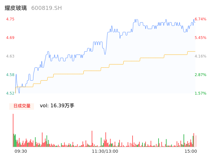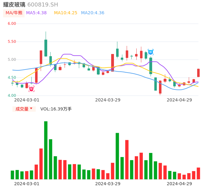 04月29日,耀皮玻璃收报4.74,股价涨幅6.52%,成交金额7624.98万元,换手率2.19%。