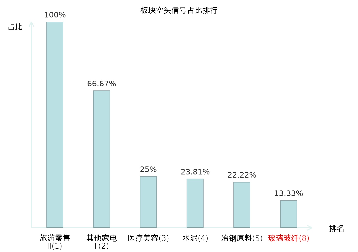 全市场所有行业板块中主力空头信号占比排名中,旅游零售Ⅱ板块位居第一。电机Ⅱ板块名次提升最快,较昨日上升113位。