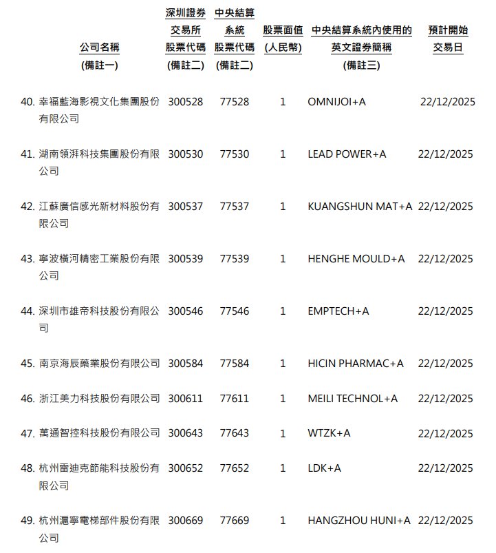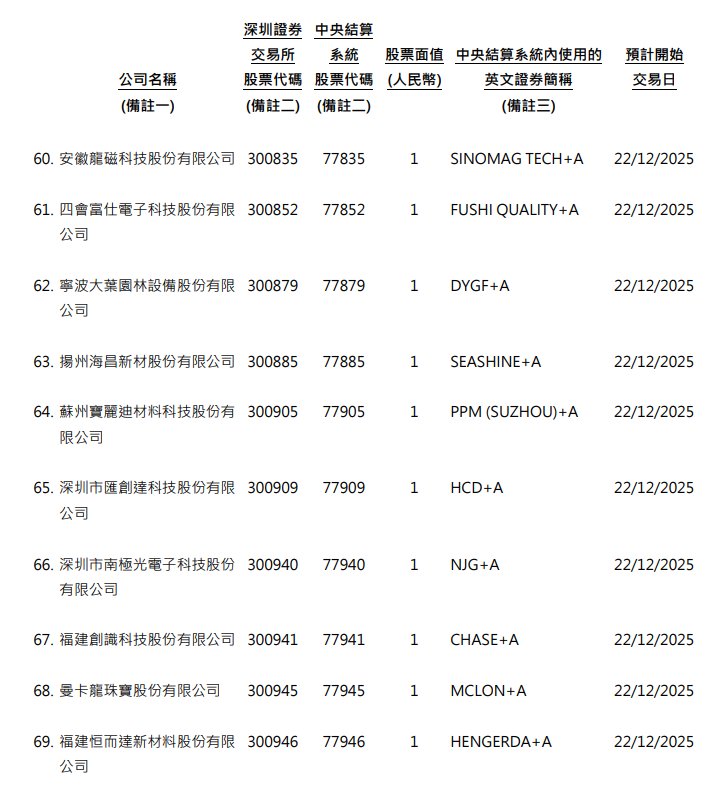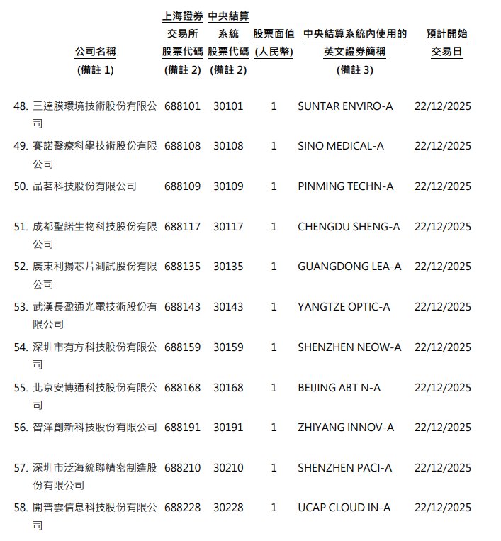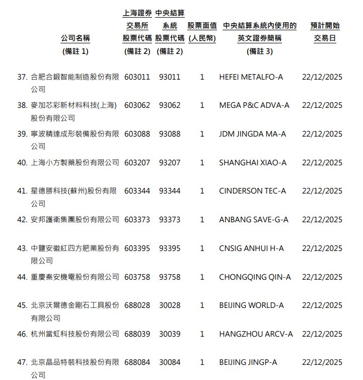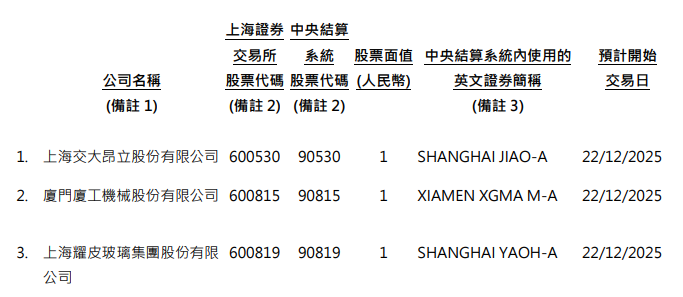 智通财经APP获悉,12月17日,港交所发布公告称,交大昂立(600530.SH)、厦工股份(600815.SH)、耀皮玻璃(600819.SH)等共73只股票获纳入沪股通;飞亚达(000026.SZ)、创元科技(000551.SZ)等共108只股票获纳入深股通,2025年12月22日生效。