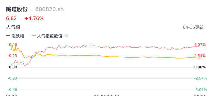 04月15日,隧道股份收报6.82,股价涨幅4.76%,成交金额4.82亿元,换手率2.27%。