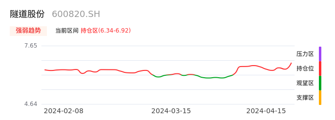 我们来看一下该股的九方特色指标强弱趋势的情况:隧道股份自03月29日从观望区上穿到持仓区。股价近期在多头区域持续强势上扬,上升动能仍较为充足,可积极关注。后续重点关注上方压力位:6.92元是否能突破上攻。