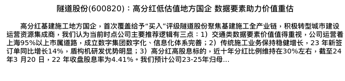 值得注意的是:2024年04月天风证券的鲍荣富/王涛/王雯分析师,首次发布关于隧道股份的研究报告,标题为:隧道股份(600820):高分红低估值地方国企 数据要素助力价值重估。