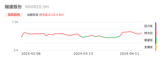 我们来看一下该股的九方特色指标强弱趋势的情况:隧道股份自03月29日从观望区上穿到持仓区。股价近期在多头区域持续强势上扬,上升动能仍较为充足,可积极关注。后续重点关注上方压力位:6.84元是否能突破上攻。