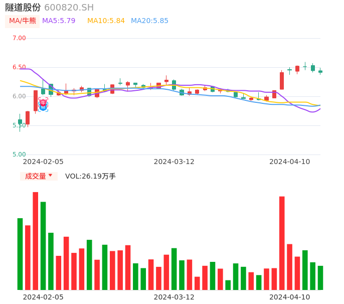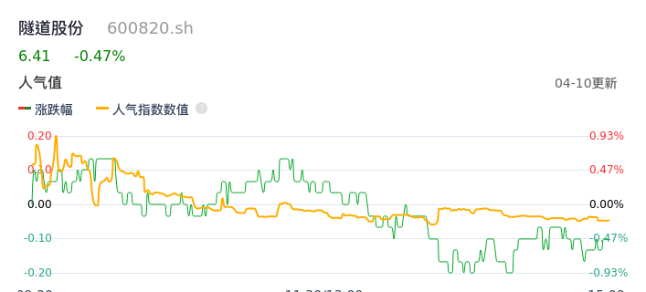 04月10日,隧道股份收报6.41,股价涨幅-0.47%,成交金额1.68亿元,换手率0.83%。