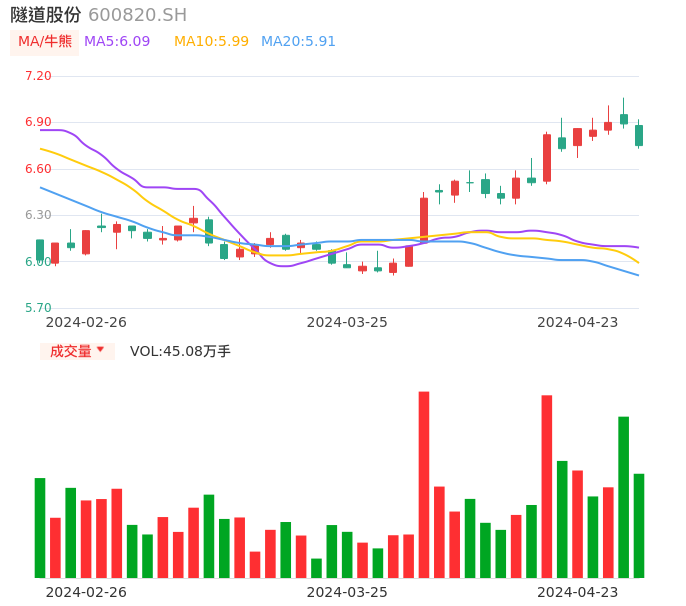 04月23日,隧道股份收报6.75,股价涨幅-2.03%,成交金额3.07亿元,换手率1.43%。