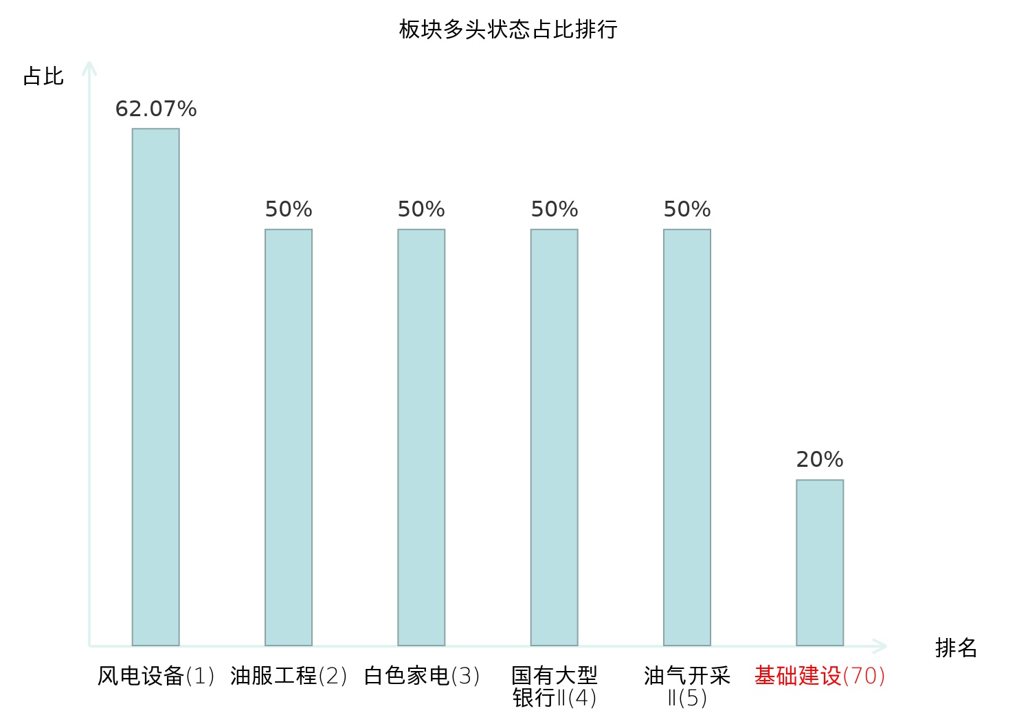 全市场所有行业板块中主力多头状态占比排名中,风电设备板块位居第一。动物保健Ⅱ板块名次提升最快,较昨日上升64位。