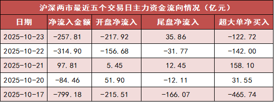 今日沪深两市主力资金开盘净流出217.92亿元,尾盘净流入35.86亿元,全天净流出257.81亿元。