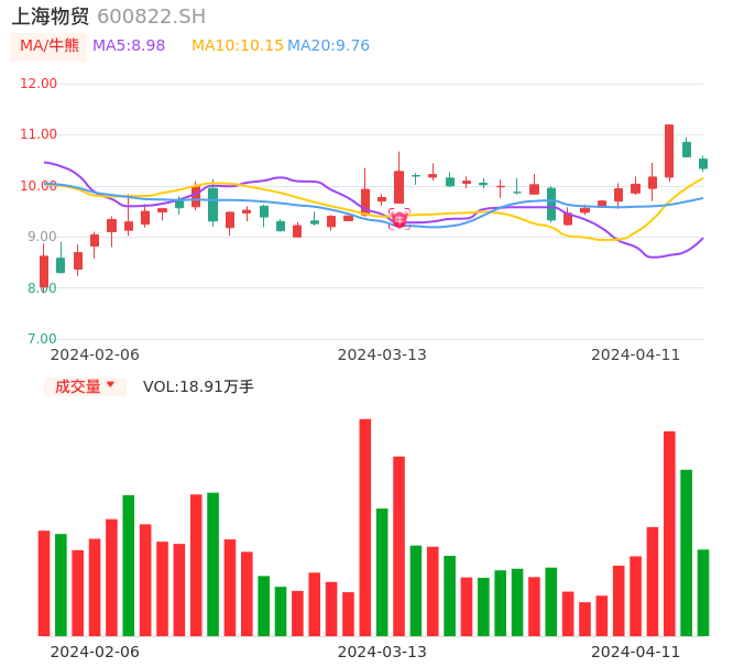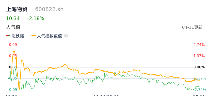 04月11日,上海物贸收报10.34,股价涨幅-2.18%,成交金额1.96亿元,换手率4.77%。