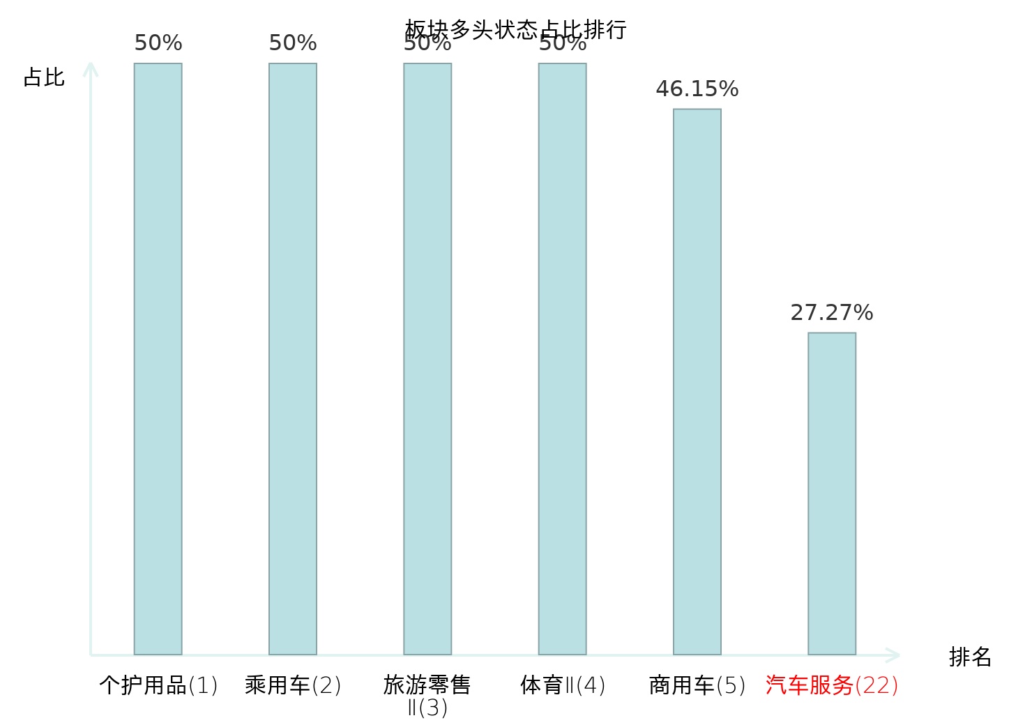 全市场所有行业板块中主力多头状态占比排名中,个护用品板块位居第一。林业Ⅱ板块名次提升最快,较昨日上升94位。