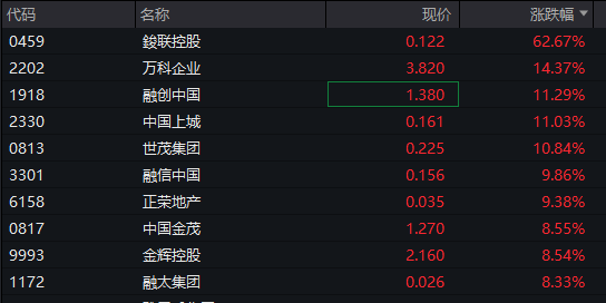 上证报中国证券网讯 12月10日午后,港股房地产板块表现活跃,截至13时42分,鋑联控股涨逾60%,万科企业涨超14%,融创中国、中国上城、世茂集团涨超10%,融信中国等纷纷走高。