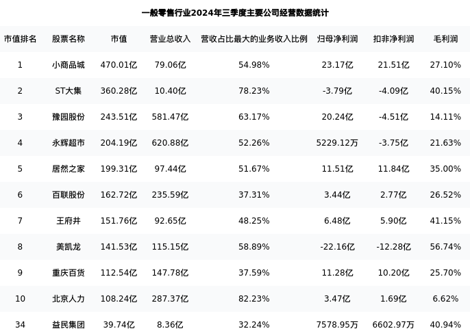 益民集团最新报告期数据为三季度,下表汇总了一般零售行业内市值靠前的公司三季度主要经营数据