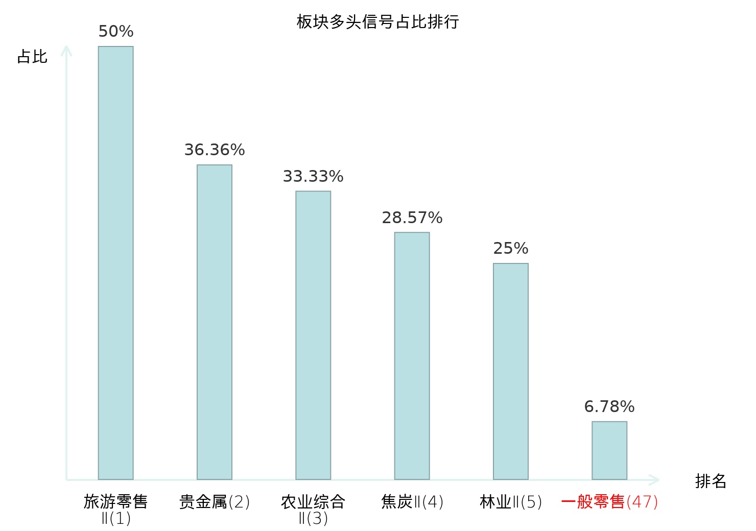 全市场所有行业板块中主力多头信号占比排名中,旅游零售Ⅱ板块位居第一。旅游零售Ⅱ板块名次提升最快,较昨日上升129位。