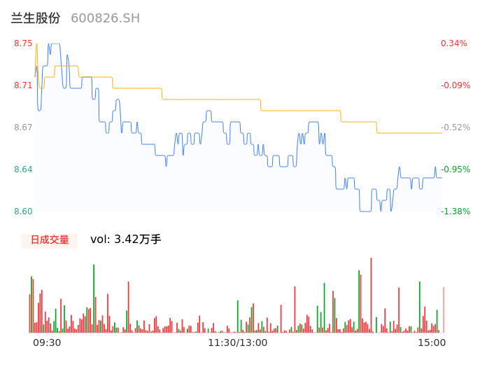 04月23日,兰生股份收报8.64,股价涨幅-0.92%,成交金额2968.46万元,换手率0.82%。