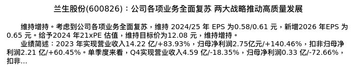 值得注意的是:2024年04月国泰君安的分析师,首次发布关于兰生股份的研究报告,标题为:兰生股份(600826):公司各项业务全面复苏 两大战略推动高质量发展。