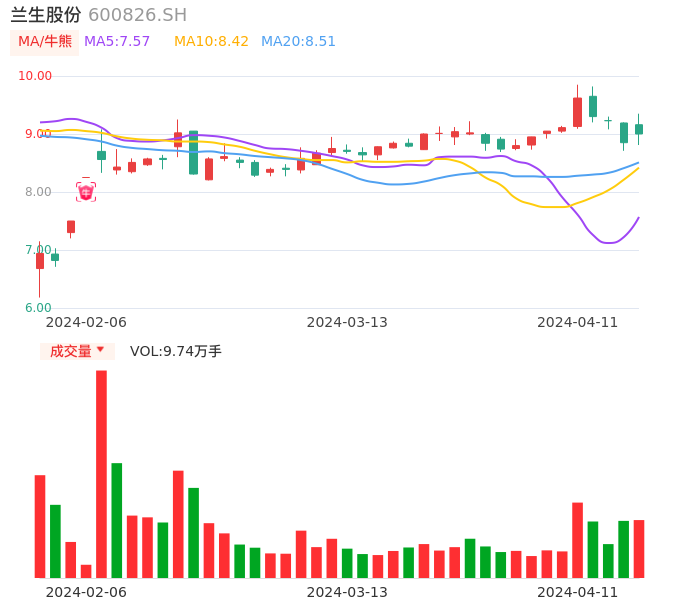 04月11日,兰生股份收报9.00,股价涨幅1.69%,成交金额8836.01万元,换手率2.33%。