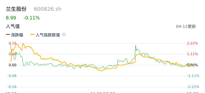 04月12日,兰生股份收报8.99,股价涨幅-0.11%,成交金额6519.99万元,换手率1.73%。