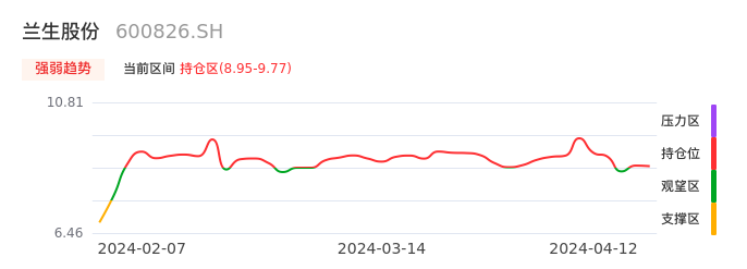 我们来看一下该股的九方特色指标强弱趋势的情况:兰生股份近日从观望区上穿到持仓区。股价短期站上多头区域,但还未完全站稳。后续重点关注多空分界点的争夺:8.95元。如未能有效站稳则可能重新回到空头行情。