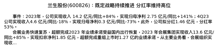 值得注意的是:2024年04月中国银河的顾熹闽分析师,首次发布关于兰生股份的研究报告,标题为:兰生股份(600826):既定战略持续推进 分红率维持高位。