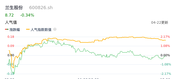 04月22日,兰生股份收报8.72,股价涨幅-0.34%,成交金额4264.31万元,换手率1.17%。