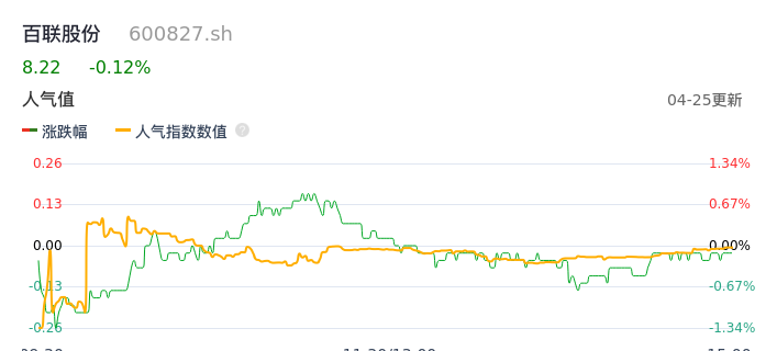 04月25日,百联股份收报8.22,股价涨幅-0.12%,成交金额4467.01万元,换手率0.34%。