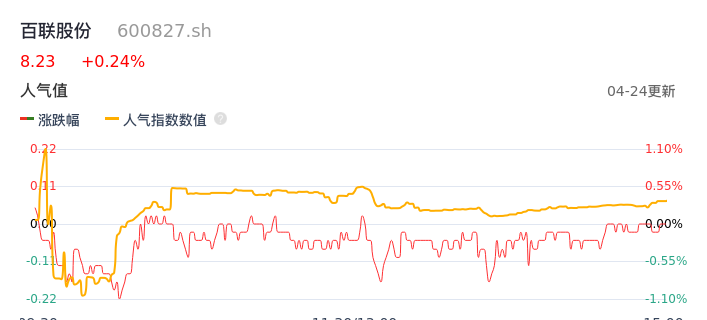 04月24日,百联股份收报8.23,股价涨幅0.24%,成交金额5692.50万元,换手率0.43%。