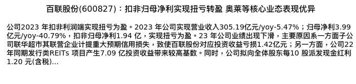 值得注意的是:2024年04月国信证券的张峻豪/孙乔容若分析师,首次发布关于百联股份的研究报告,标题为:百联股份(600827):扣非归母净利实现扭亏转盈 奥莱等核心业态表现优异。