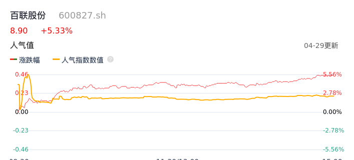 04月29日,百联股份收报8.90,股价涨幅5.33%,成交金额1.23亿元,换手率0.88%。