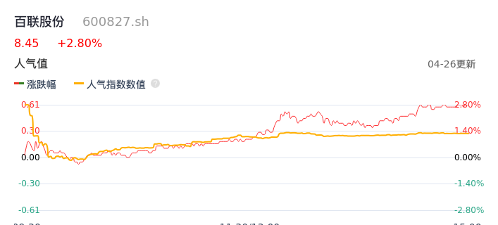04月26日,百联股份收报8.45,股价涨幅2.80%,成交金额8441.64万元,换手率0.63%。