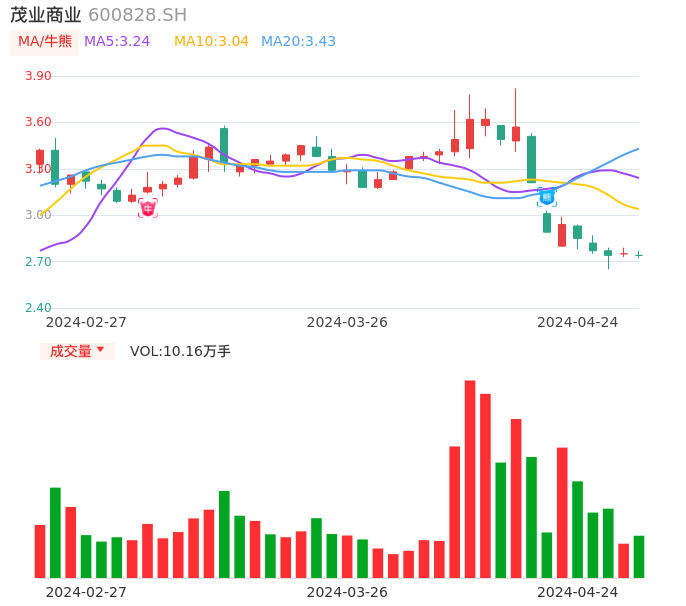 04月24日,茂业商业收报2.74,股价涨幅-0.36%,成交金额2784.54万元,换手率0.59%。