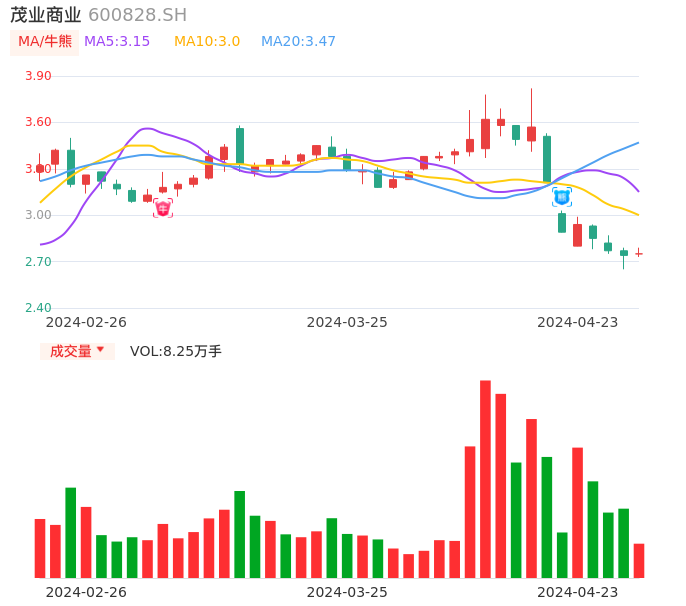 04月23日,茂业商业收报2.75,股价涨幅0.36%,成交金额2270.81万元,换手率0.48%。