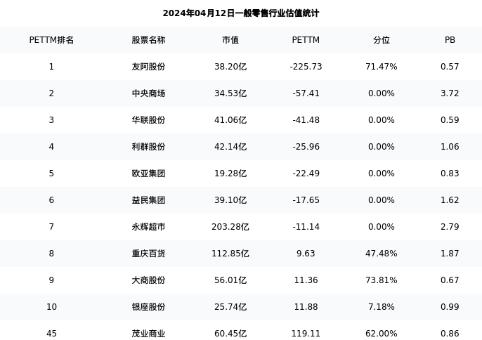 从估值角度看:茂业商业最新市盈率PETTM为119.11,在行业内排名38/62,处于62.00分位。