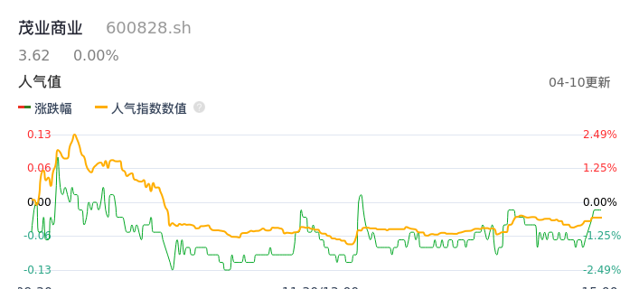 04月10日,茂业商业收报3.62,股价涨幅0.00%,成交金额1.59亿元,换手率2.56%。