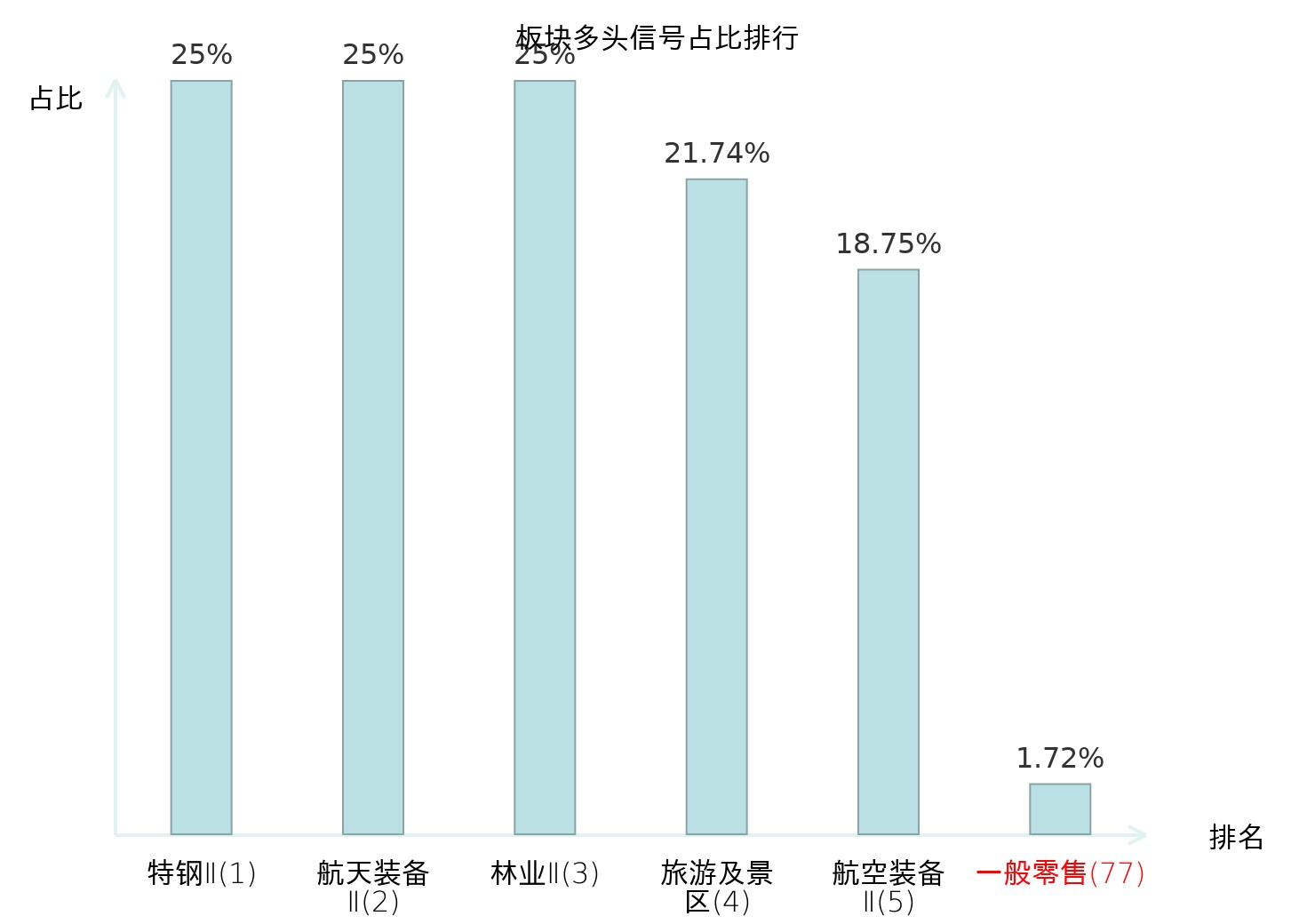 全市场所有行业板块中主力多头信号占比排名中,特钢Ⅱ板块位居第一。林业Ⅱ板块名次提升最快,较昨日上升122位。