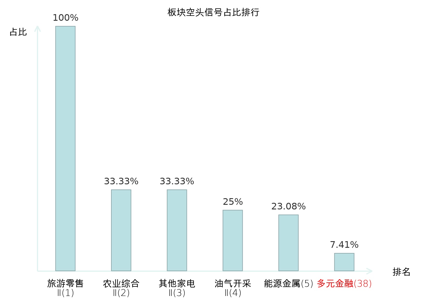 全市场所有行业板块中主力空头信号占比排名中,旅游零售Ⅱ板块位居第一。影视院线板块名次提升最快,较昨日上升105位。