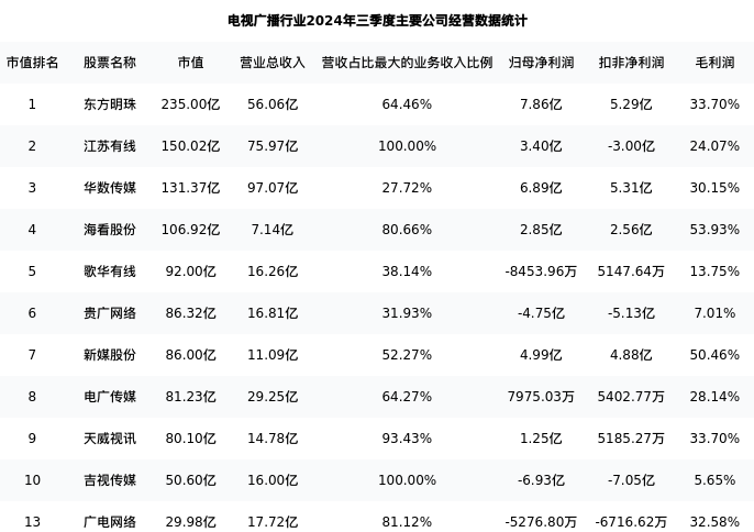 广电网络最新报告期数据为三季度,下表汇总了电视广播行业内市值靠前的公司三季度主要经营数据