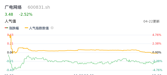 04月22日,广电网络收报3.48,股价涨幅-2.52%,成交金额3240.16万元,换手率1.32%。
