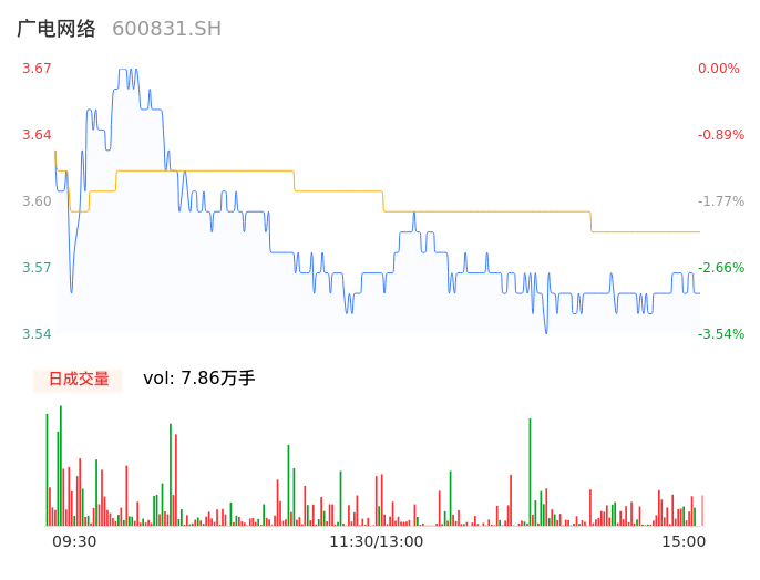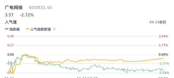 04月19日,广电网络收报3.57,股价涨幅-2.72%,成交金额2820.49万元,换手率1.11%。