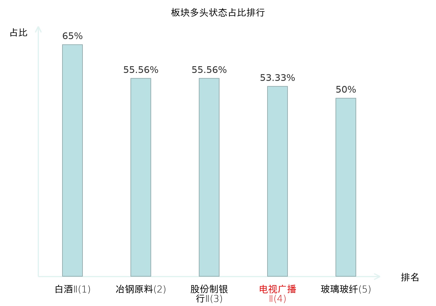 全市场所有行业板块中主力多头状态占比排名中,白酒Ⅱ板块位居第一。白酒Ⅱ板块名次提升最快,较昨日上升71位。