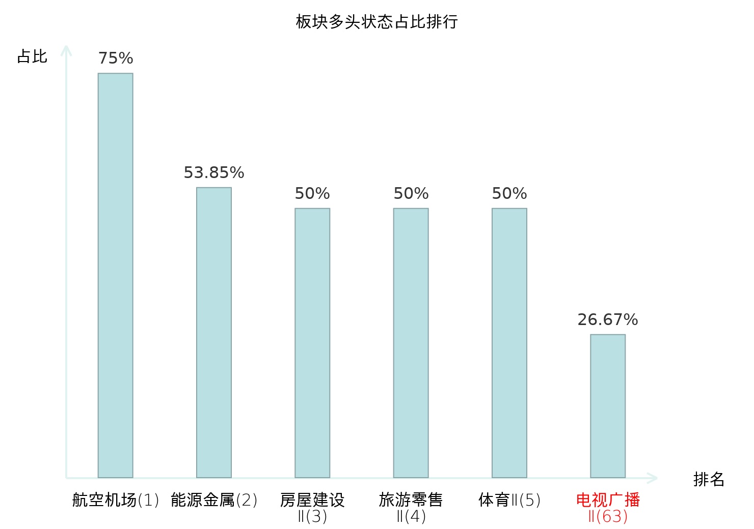 全市场所有行业板块中主力多头状态占比排名中,航空机场板块位居第一。其他电子Ⅱ板块名次提升最快,较昨日上升53位。