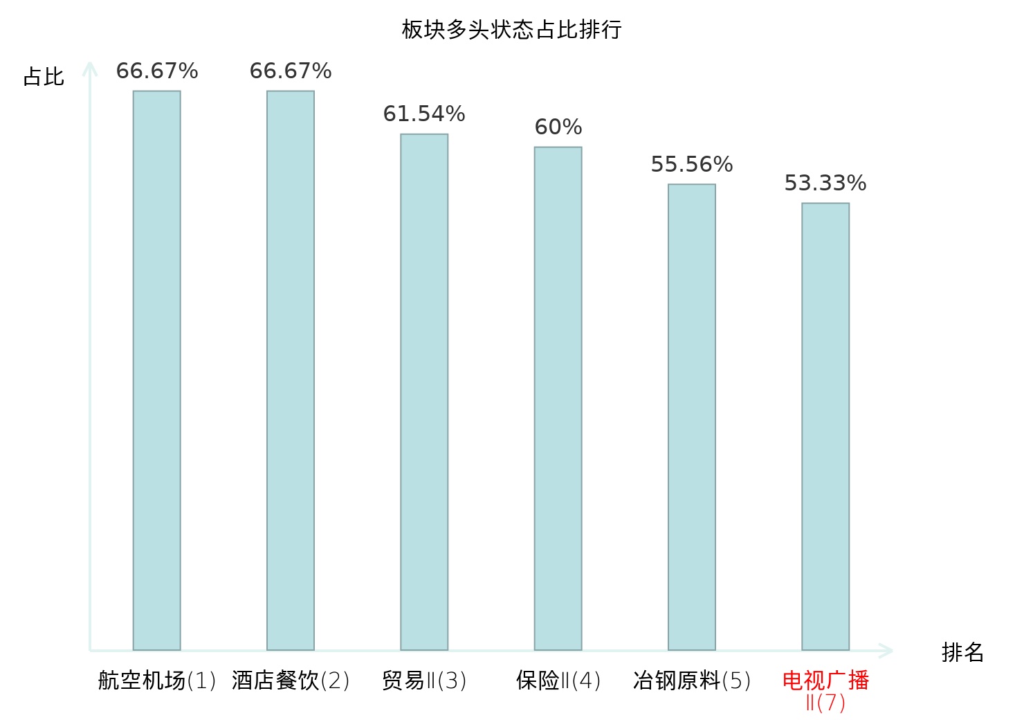 全市场所有行业板块中主力多头状态占比排名中,航空机场板块位居第一。农业综合Ⅱ板块名次提升最快,较昨日上升64位。