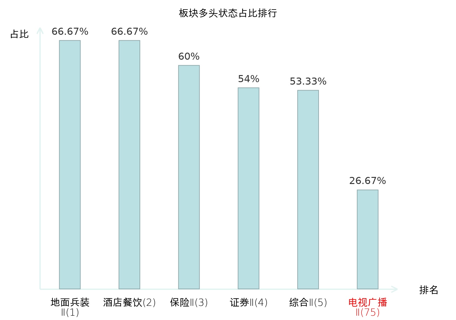 全市场所有行业板块中主力多头状态占比排名中,地面兵装Ⅱ板块位居第一。计算机设备板块名次提升最快,较昨日上升48位。