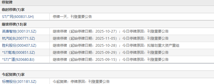 上证报中国证券网讯 11月7日,1家公司临停:ST广网,1家公司复牌:标榜股份。