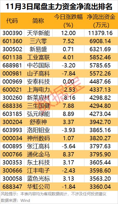 阳光电源和拓维信息尾盘主力资金净流入均超1.2亿元,居前;还有香农芯创、沪电股份、中际旭创和利欧股份等尾盘主力资金净流入金额居前。