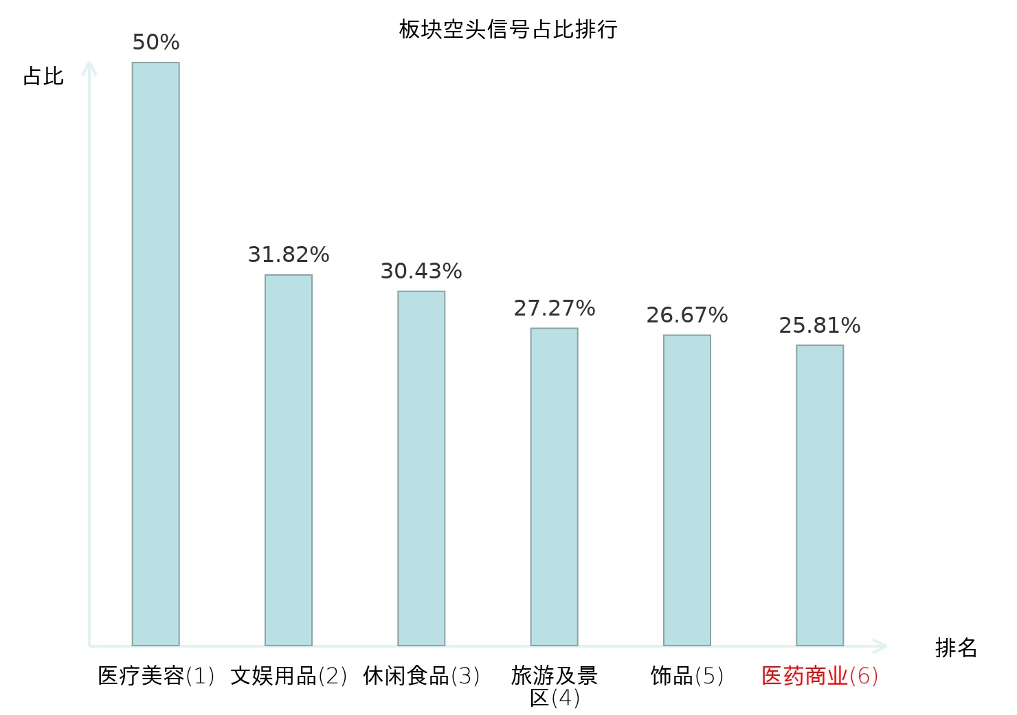 全市场所有行业板块中主力空头信号占比排名中,医疗美容板块位居第一。服装家纺板块名次提升最快,较昨日上升114位。
