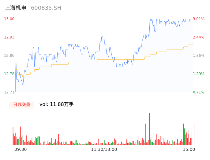 04月17日,上海机电收报13.00,股价涨幅3.01%,成交金额1.53亿元,换手率1.47%。
