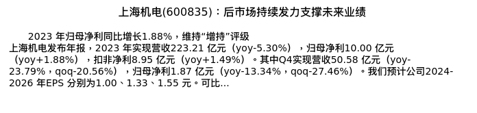 值得注意的是:2024年03月华泰证券的倪正洋分析师,首次发布关于上海机电的研究报告,标题为:上海机电(600835):后市场持续发力支撑未来业绩。