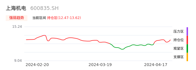 我们来看一下该股的九方特色指标强弱趋势的情况:上海机电自04月11日从观望区上穿到持仓区。股价近期在多头区域持续强势上扬,上升动能仍较为充足,可积极关注。后续重点关注上方压力位:13.62元是否能突破上攻。