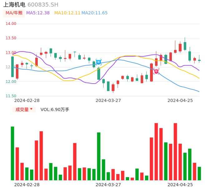 04月25日,上海机电收报12.72,股价涨幅-0.70%,成交金额8787.91万元,换手率0.86%。