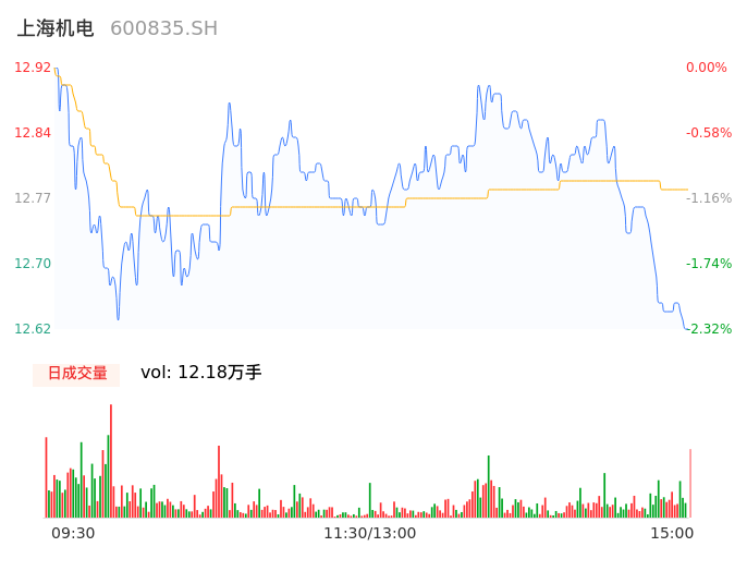 04月16日,上海机电收报12.62,股价涨幅-2.32%,成交金额1.56亿元,换手率1.51%。
